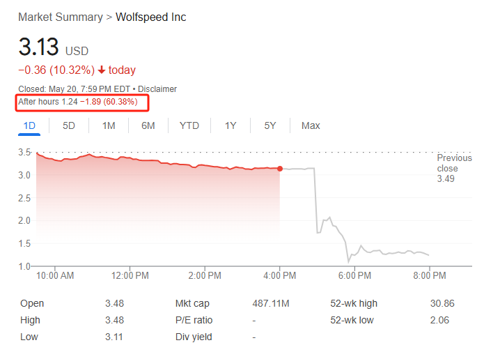 作为碳化硅芯片制造商,Wolfspeed本月早些时候已表达了对自身持续经营能力的担忧,并预测其年收入将低于预期。公司预计2026年收入将达到8.5亿美元,但这一数字远低于分析师预期的9.587亿美元。而此前3月底,Wolfspeed芯片法案拨款悬而未决以及可转债再融资遇阻曾暴跌50%。周二破产重组消息后,美股盘后,Wolfspeed跳水60%。