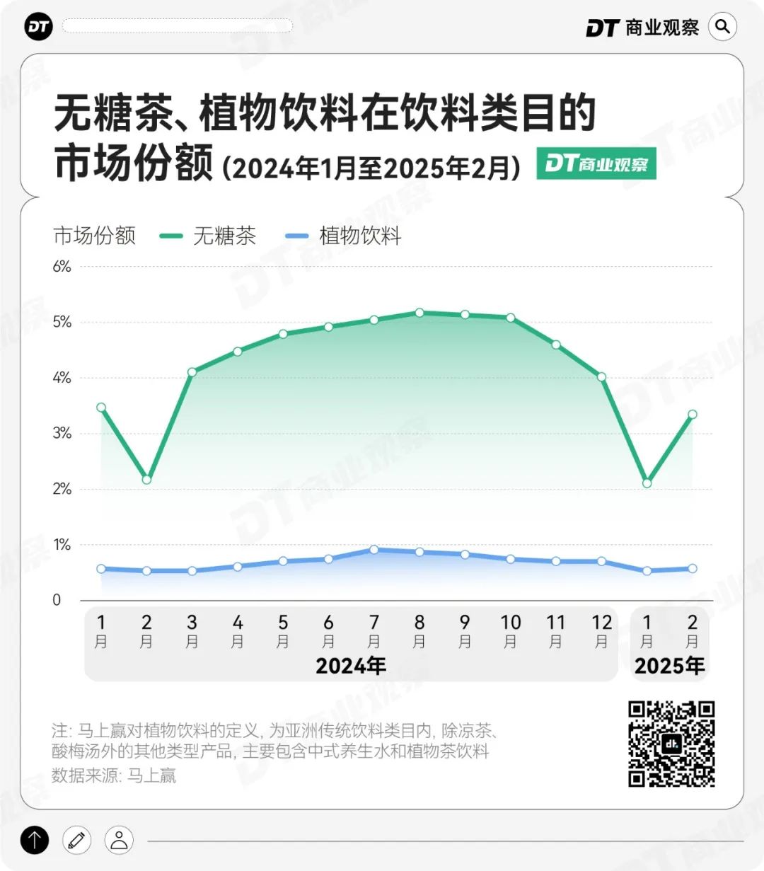 二,根据马上赢数据,2024Q2~2025年Q1,无糖茶在饮料大品类的份额大概是2%~5%,而植物饮料(包含中式养生水和植物茶饮料,不包含凉茶和酸梅汤)的占比基本维持在0.5%~0.9%之间。