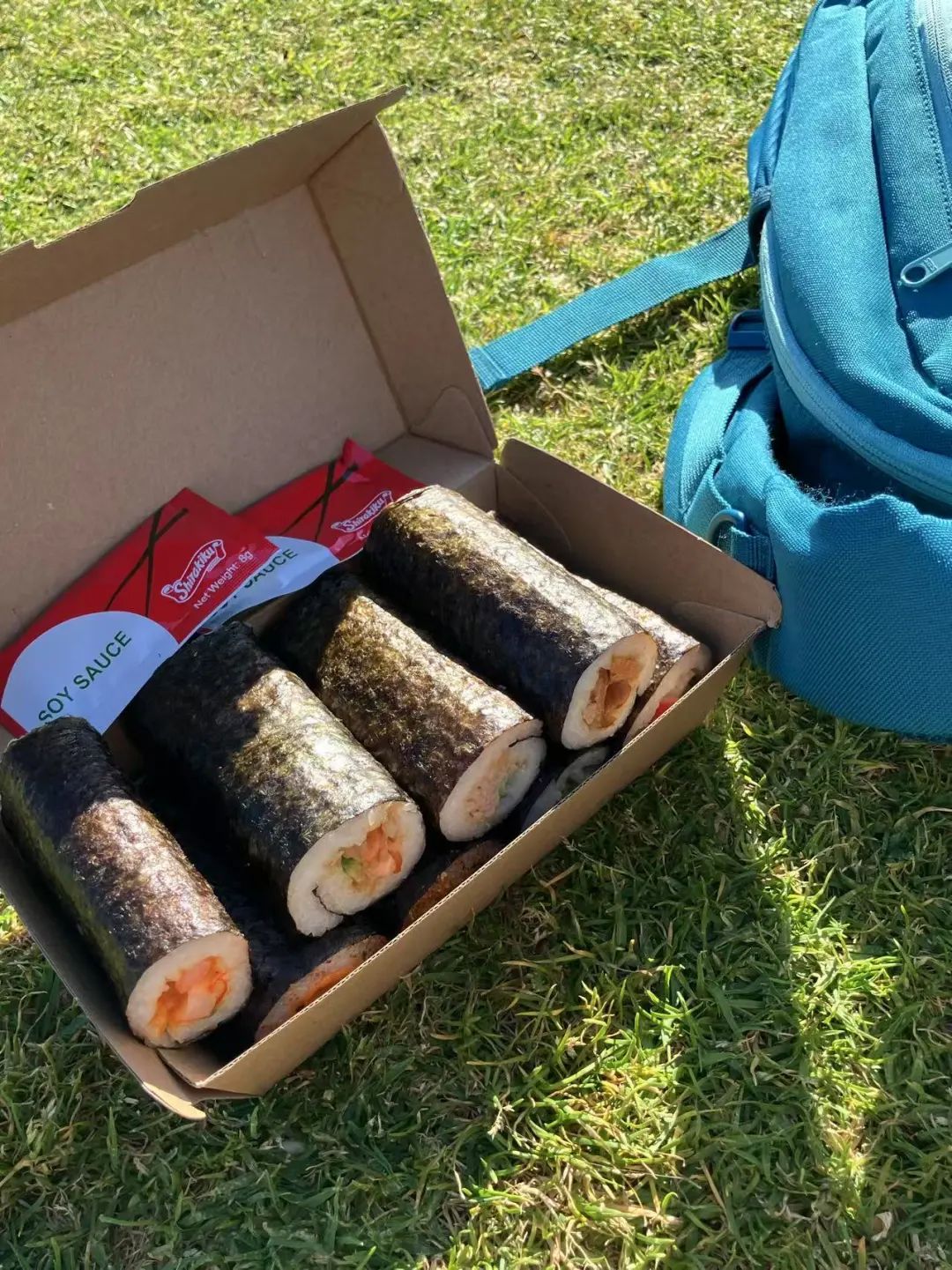 上:自己下厨,有肉有菜,两个人吃,成本大概8澳元;下:在一个减少剩食浪费的APP上花6澳元能买到6卷紫菜包饭,去餐厅点一卷紫菜包饭就要20澳元。