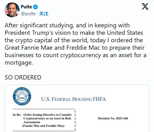 • 🏦 命令发布:FHFA署长下令房利美和房地美准备将加密货币列为抵押贷款资产。