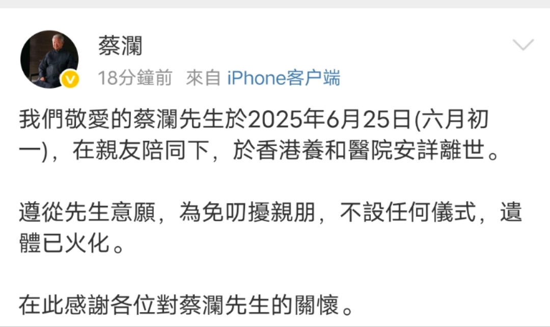 虎嗅注:@蔡澜 官方微博发布消息:我们敬爱的蔡澜先生于2025年6月25日(六月初一),在亲友陪同下,于香港养和医院安详离世。