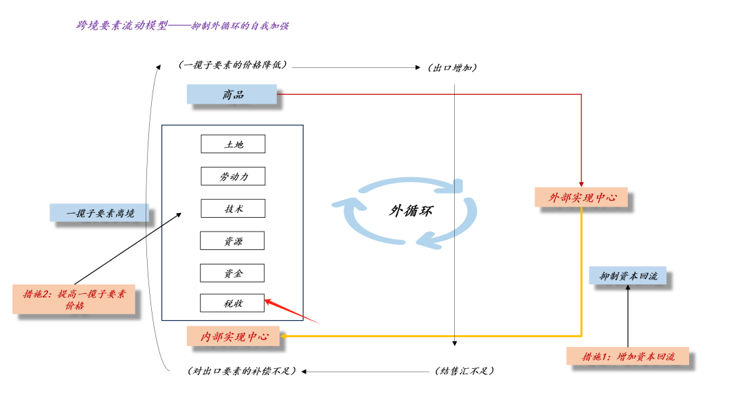 上图刻画了提高提高工资水平对内循环的影响,对企业部门来说,它既增加了工资支出,又增加了商品收入;对居民部门来说,它既增加了工资收入,又增加了商品支出。
