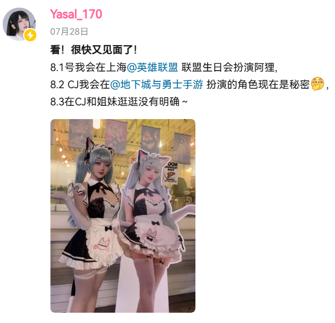 根据Yasal、RZCOS、英雄联盟、ChinaJoy官方发布的消息综合来看,RZCOS的几位coser行程是8月1日出席英雄联盟的生日会活动,8月2日将分别出席DNF、IGG等游戏和企业的相关项目。其中Yasal公布的商业活动为8月1日和8月2日,她个人8月3日的行程本应是CJ自由行(Yasal的说法是“没有明确”)。