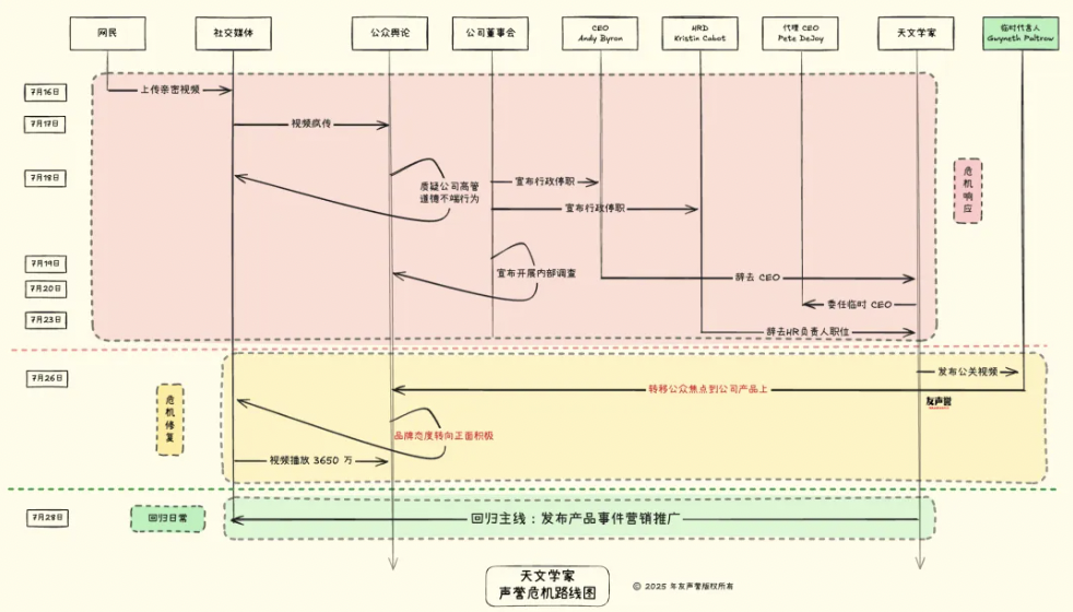 AI公司Astronomer CEO因音乐会亲密行为丑闻引发声誉危机,董事会立即安排涉事高管休假并致使其辞职。面对随之而来的巨大流量,公关团队认为可借此机会修复声誉,而非保持沉默。他们邀请与事件相关名人Gwyneth Paltrow担任临时发言人发布幽默视频,巧妙将公众焦点从道德丑闻转移到公司核心业务和即将举办的活动上,成功实现声誉回升并完成危机公关反转。