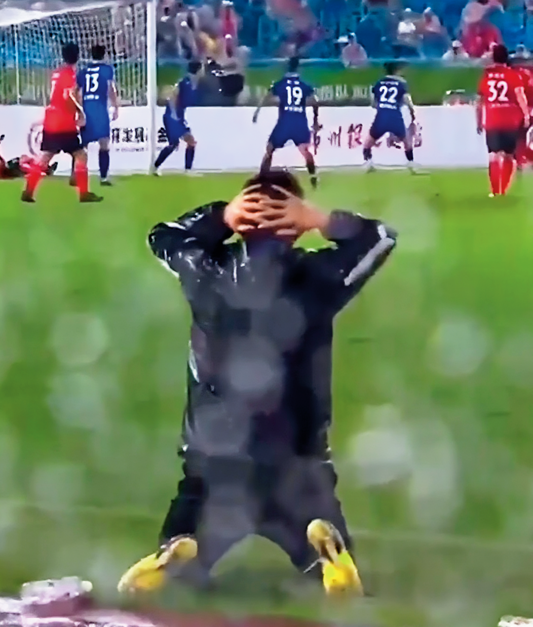 比赛倒计时10分钟,球员体能接近极限。常州队4次发起冲锋,猛攻球门,只可惜越位、擦框……直到终场哨声响起,他们离进球都只差一点点。作为主教练之一的恽铮悲伤地跪倒在雨里。