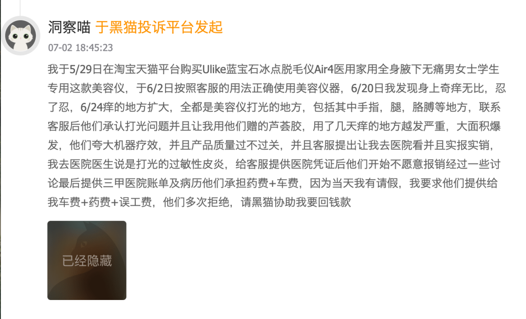 在各类社交媒体,可以见到有不少用户反馈使用脱毛仪后出现皮肤问题、因而提起退货退款投诉。