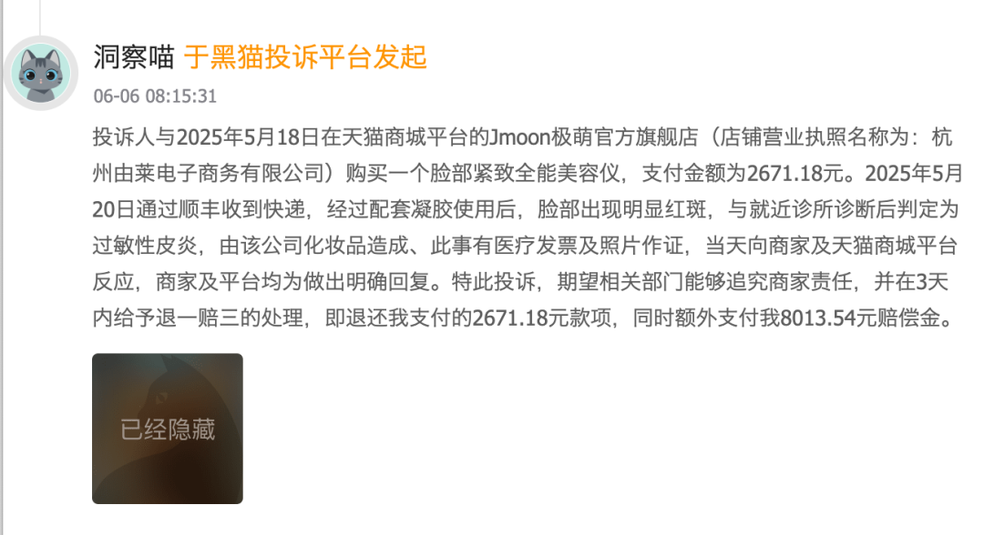 公开信息显示,而极萌同样曾爆出过使用产品诱发皮肤过敏、售后冷处理的案例。