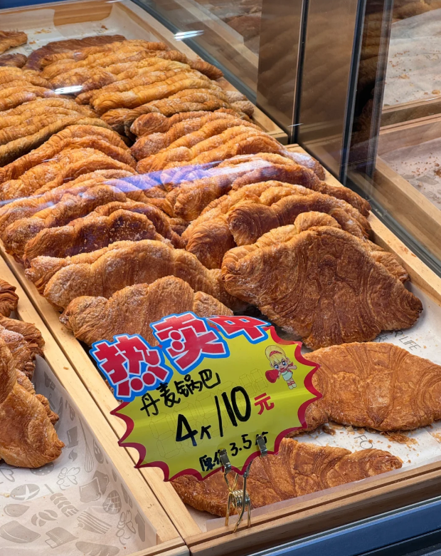 去年,压扁可颂在北上广烘焙店里流行,鹤岗的面包店也快速引进,取了个东北别名,“丹麦锅巴”,10块钱4个。“可颂到了东北也得入乡随俗,尊称一声欧洲老乡。”