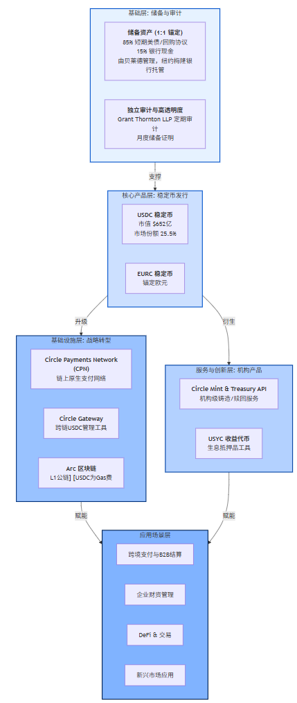 Circle以合规的稳定币发行为基石,向上构建了面向机构的金融产品与服务,并进一步战略转型为Web3原生金融基础设施提供商,其核心业务生态系统逻辑关系如下: