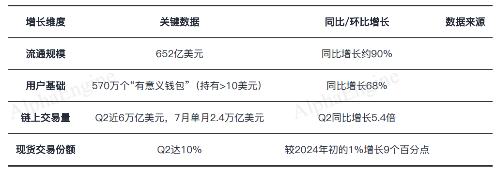 在强劲股价表现的背后,是其核心产品USDC业务规模与市场地位的爆发式增长。截至2025年8月,USDC的关键增长指标表现突出,验证了其在稳定币市场的强劲扩张势头。