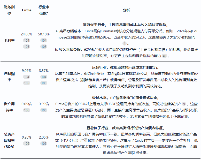 财务比率对比:Circle的财务比率表现出与行业显著的结构性差异,这深刻反映了其以稳定币储备为核心的独特商业模式。公司在盈利转化效率上表现卓越,但在资产利用效率上则远低于行业平均水平。