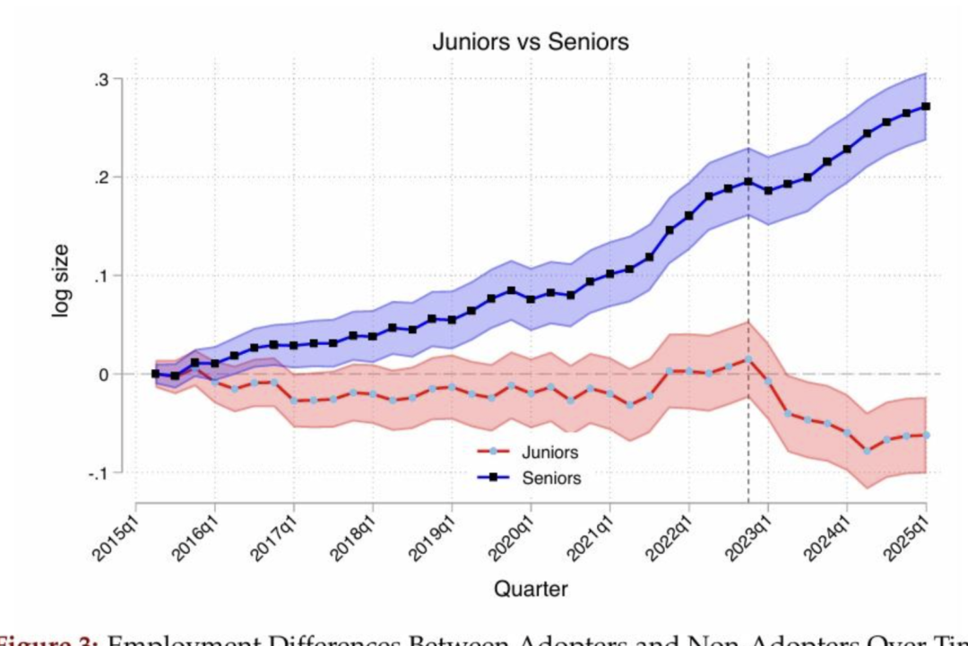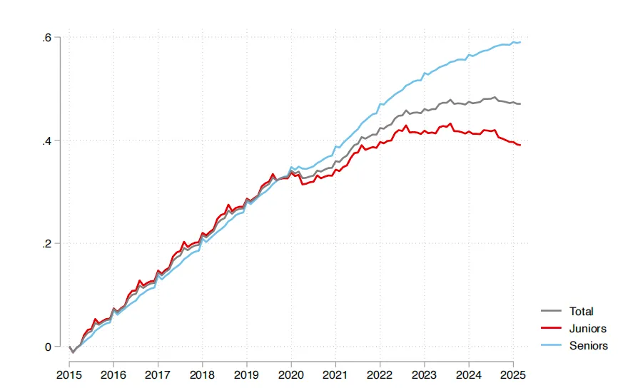 生成式AI正在以一种“资历偏向”的方式重塑劳动力市场,即对初级员工的影响远大于对高级员工的影响。