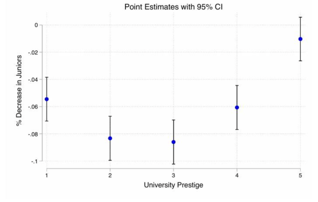 研究发现,AI对就业的负面影响呈现出一种独特的“U型”模式,映射到关内的情况就是:双非本科毕业生受影响最大,而985、211大学的毕业生和专科生受到的影响则相对较小。