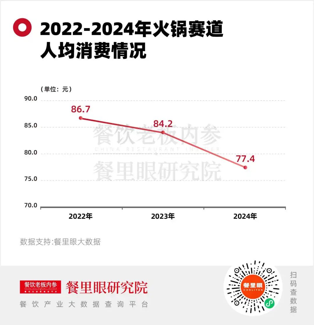 再加之,消费趋势往理性消费与情绪消费两端发展,餐饮客单价集体下滑。《中国餐饮发展报告2025》显示,火锅人均消费从2022年的86.7元,跌至2025年的77.4元,四年降幅达11%。火锅早已进入了微利阶段。