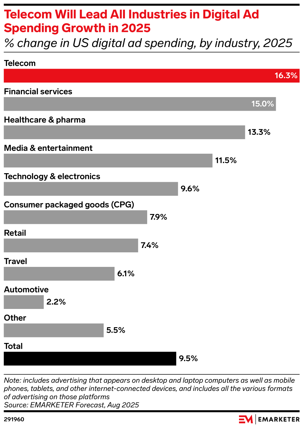 更重要的是,这一年,电信行业的数字广告总支出首次超过了汽车行业——这是 eMarketer 自 2016 年开始追踪以来的第一次“超车”。我认为,这个节点的意义不止是预算位次的改变,而是“谁还在增长”这个问题的答案,开始由非典型广告主来给出。