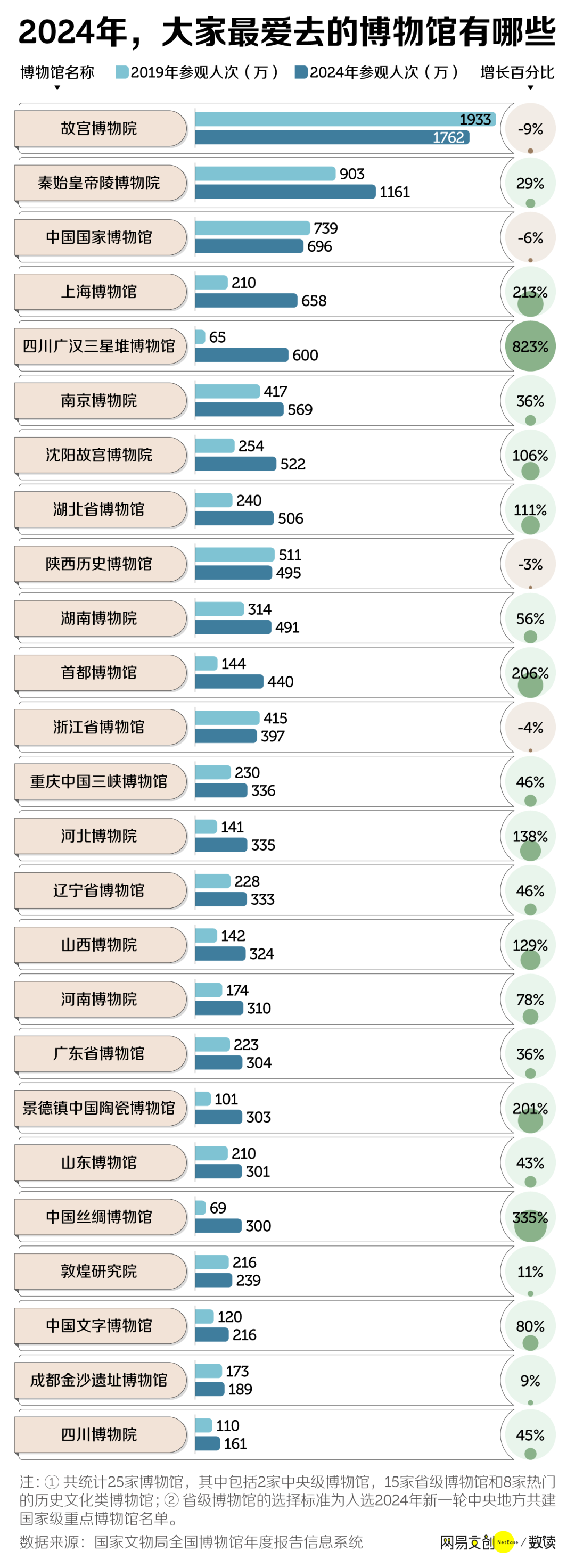 • 📈客流量暴涨:2024年博物馆参观人次达13.3亿创新高,故宫国博霸榜头部,三星堆客流五年激增823%。