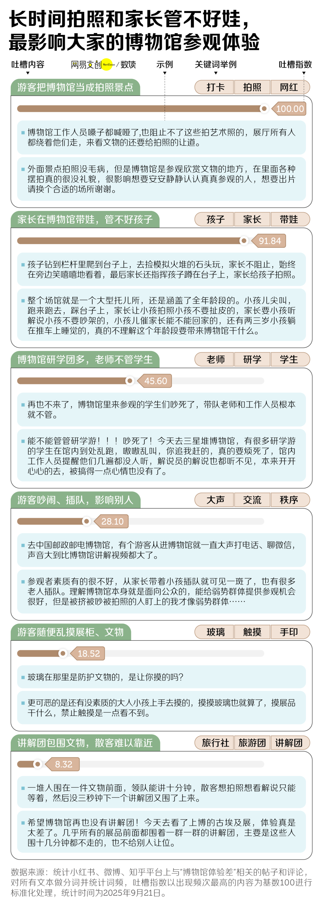 • 👶研学团乱象:未成年人占比超1/4,部分研学团疏于管理致孩童打游戏、喧闹,影响普通游客体验。