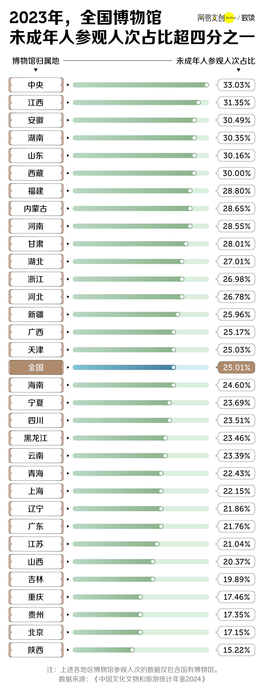 分省份来看,江西、安徽、湖南、山东和西藏的博物馆,未成年人参观人次占比均超过了三成。而在福建、内蒙古、河南、甘肃等省份,未成年人参观的比例同样跑赢全国平均线。