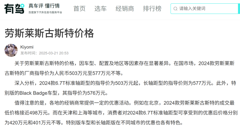 虽然劳斯莱斯官方指导价保持稳定,但为应对市场调整,国内的终端市场频繁出现灵活促销。有车主在汽车论坛发文称,2024款古斯特车型在北京地区优惠后价格降至498万元,天津、上海等地甚至出现401万~420万元的成交价。
