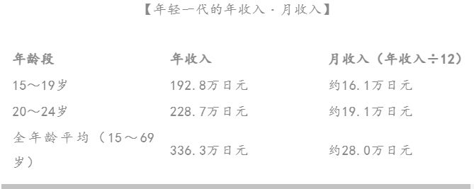 根据厚生劳动省《令和5年(2023年)工资结构基本调查结果概要》的数据,年轻一代的年收入和月收入的情况如下: