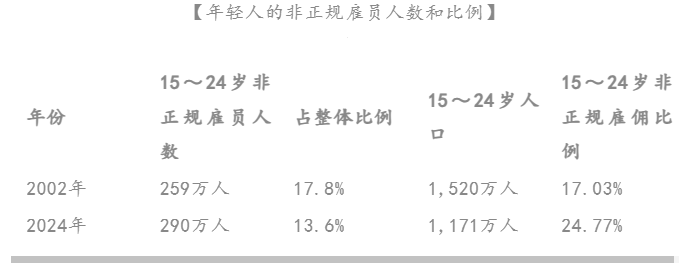 而从下表可以看出,年轻人在非正规雇员中的占比也在不断增加。