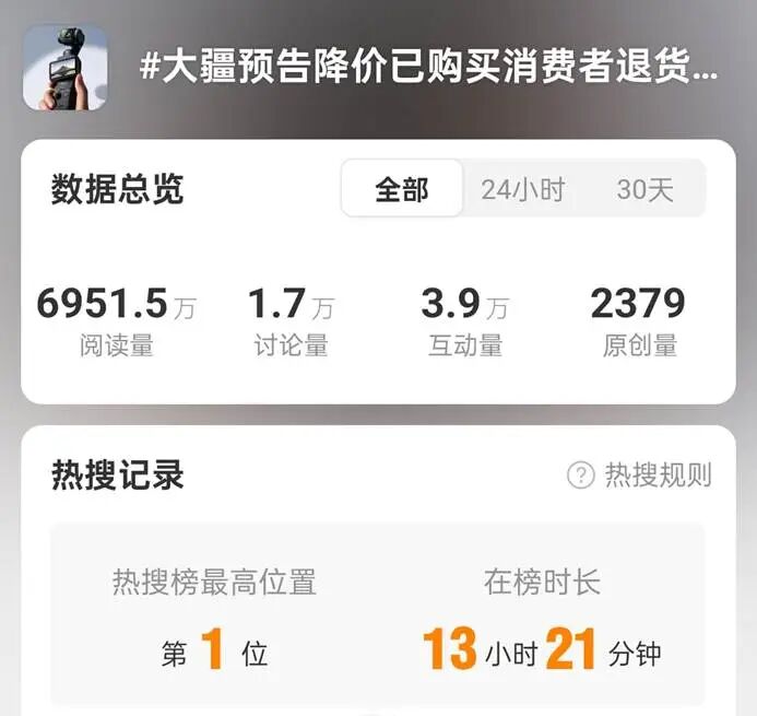 社交媒体上,“大冤种” 的自嘲与维权声浪迅速将大疆推上热搜,线上线下渠道的售后标准差异更引发热议。