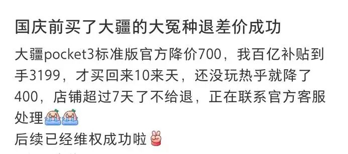 自大疆2025年10月初预告降价以来,社交媒体上涌现出大量“维权”声音,不少刚下单的消费者自嘲成了“大冤种”。