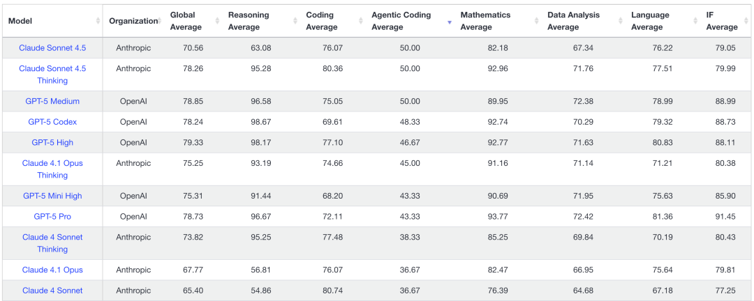 选择 Agentic Coding Average(智能体编程任务平均得分)后,模型排行榜,Claude Sonnet 4.5 位于第一名。来源:https://livebench.ai/