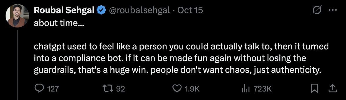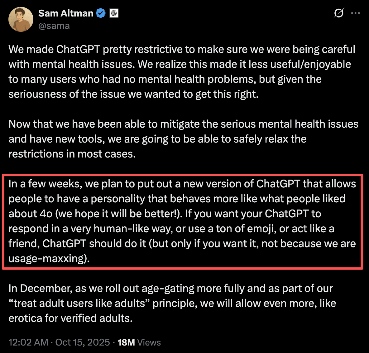 在奥特曼的官宣推文中,除了添加“色情内容”之外,OpenAI 还计划推出新版本的 ChatGPT,其“行为更接近人们喜欢的 4o”。