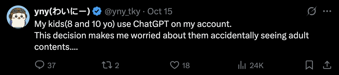 此外也有用户表示,未成年小孩在自己的账户中使用ChatGPT,这让她很担心他们无意中看到成人内容。
