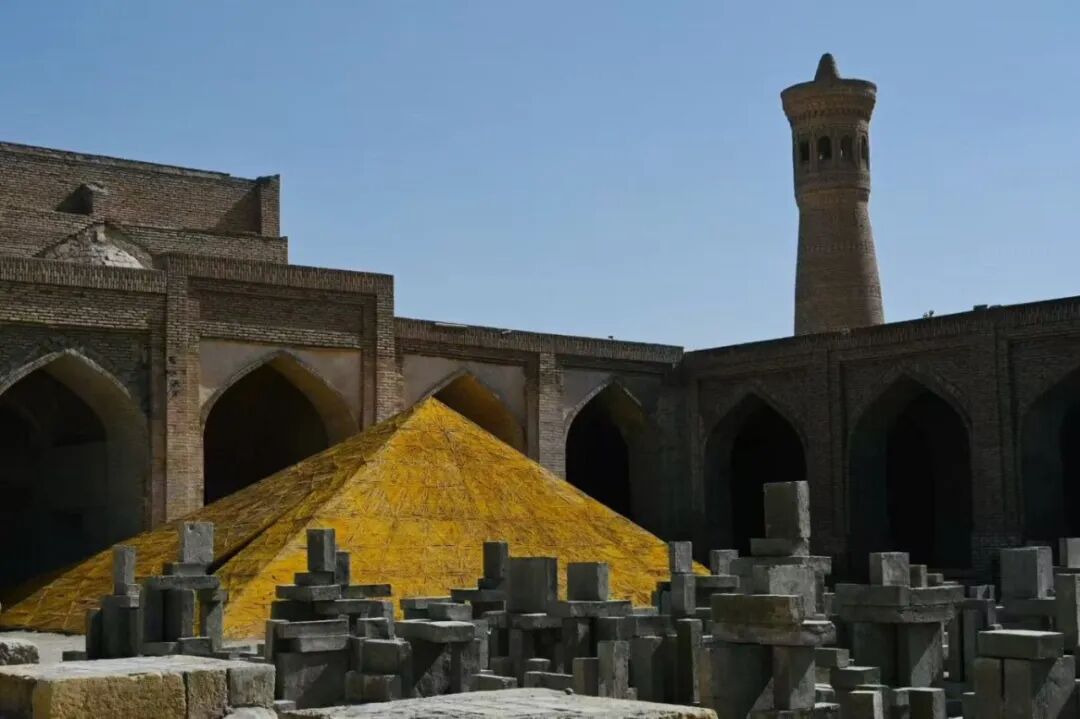 或许是因为我们有一种置身事内的熟悉,现代总是比古代要面对更多的争议,但现代并不是总是坏事——你总是可以以一些新的视角和形式,对传统生活进行再诠释,而反之就未必能成立。比如,我在布哈拉碰到当地正在举办的双年展。城里面诸多经学院遗址并没有如撒马尔罕一般“修旧如新”地复原,而是保持着一种沧桑的坍圮感,变成现代艺术的寄身之地。于是老城的游览,变得有些像一场主题游园会。