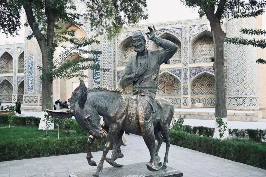 在白日的末尾,我在布哈拉广场的一角偶遇了纳斯尔丁雕像(Nasreddin,这个在伊斯兰世界鼎鼎有名的喜剧人物,在中国有个别致的名字——“阿凡提”),他骑着驴,做出一副有趣而冒犯的表情。在一群游客吵吵嚷嚷地散场后,我感到他的笑容好像冲着我动了一下。