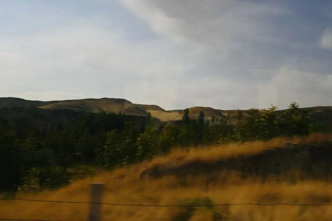 列车行驶在中亚连绵的云海和草原之间。云朵如鳞片般铺满天空,阳光勾勒着它们的缝隙,地下的野草和半空的扬沙共享同一种灰黄,一派萧瑟的秋天气息。