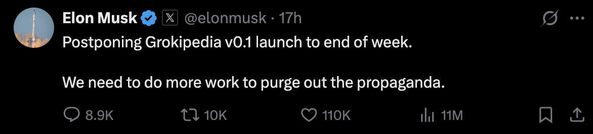 10月21日凌晨,马斯克在X 发文表示推迟推出Grok百科 0.1版本(Grokipedia v0.1),并表示“我们仍需投入更多精力清除宣传性内容。”