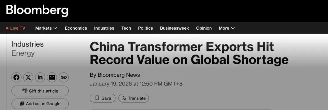 据中国海关总署在1月18日公布的数据,去年中国变压器出口额达到创纪录的646亿元人民币,同比增长近36%,达到了历史新高;工厂的订单已经排到2026 年之后,需求极其旺盛。