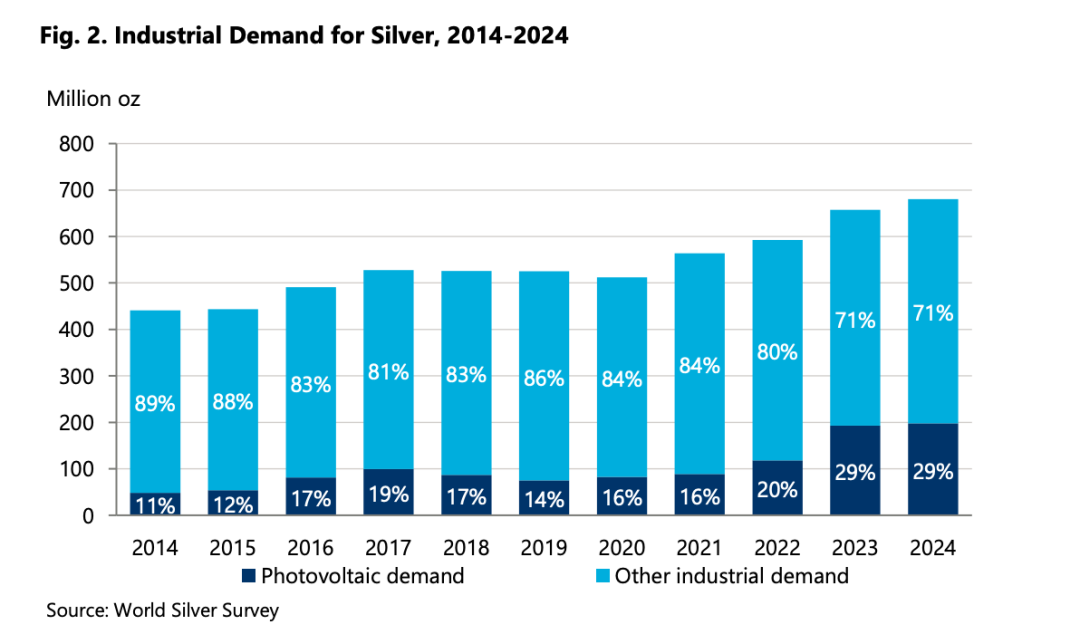 当然,白银一直维持高价格会带来“节银”效应,比如一些光伏厂商已经在减少每块电池板的银浆用量。但Silver Institute的预测是,即使考虑节银效应,未来1-2年工业需求仍将保持在接近纪录的水平。