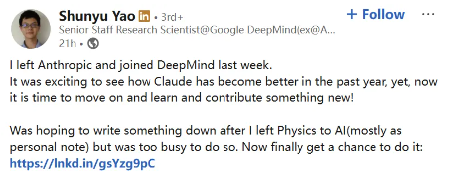 但故事没有在离职中结束。离开Anthropic仅10天后,姚顺宇就加入了Google DeepMind,担任高级研究科学家(Senior Staff Research Scientist),且直接进入核心Gemini团队。
