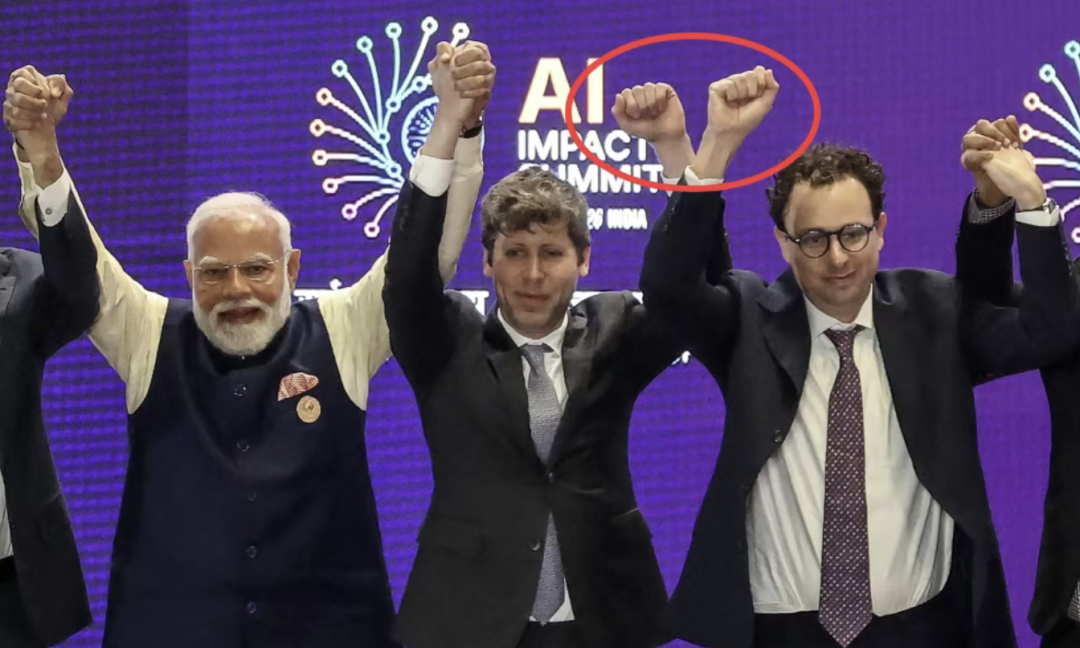 最近有个事很有意思。印度在新德里用五天时间,办了一场号称迄今为止亚洲规模最大、规格最高的AI峰会,硅谷几乎半壁江山都飞了过来。当地官方媒体用的词是:AI时代的新德里时刻。但就在全场情绪最高涨的那一刻,两个画面突然定格下来,轻轻戳破了现场有些过于完美的气氛。第一个画面,发生在舞台中央。莫迪站在正中间,微笑着伸出……