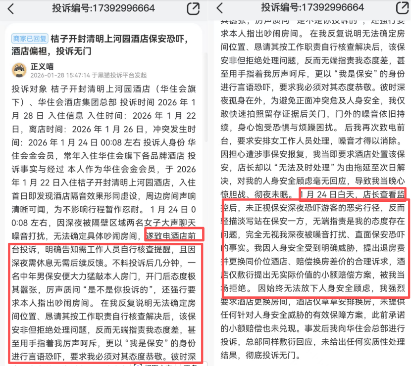 《BUG》栏目注意到,在黑猫投诉上,今年1月28日,便曾发生过一起桔子酒店安保人员恐吓入住顾客的投诉。据投诉人反映,其于今年1月22日—26日入住了位于开封清明上河园的桔子酒店,因酒店隔音效果差影响作息,遂致电前台投诉处理,结果却遭到该酒店安保人员“大力敲门”质问,最终该安保人员非但拒绝处理问题还指责其“态度差”,并用手指其“厉声呵斥”。