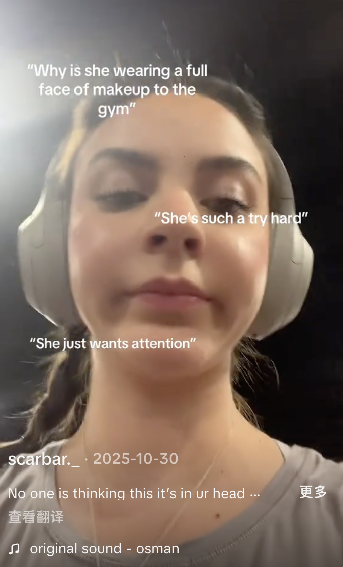 就像是在Tiktok这样的社交媒体上,随处可见无数女性发布视频,说因为在健身房化妆而遭到羞辱,或者担心会遭到羞辱。与此同时,还有人认为,那些带妆去运动的女性是虚荣、缺乏安全感,只是为了获得男性认可。